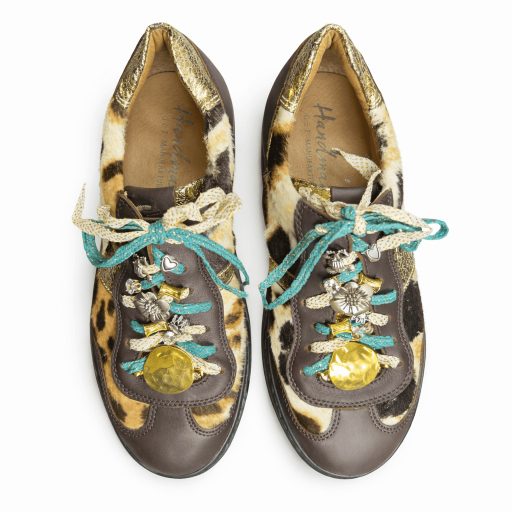 A Makány Márta sneakerekhez kínált türkiz fűző és charm díszítés finom, kiegészíti a cipő karakterét. Kifejezetten az ocelot mintás sneaker megjelenéséhez tervezve, a kiegészítő színvilágával és részletgazdagságával harmonikusan illeszkedik a cipő markáns felületéhez. A türkiz tónusú fűzők friss, élénk kontrasztot teremtenek, miközben a rétegzett fém charmok és a hangsúlyos medál gazdag, mégis kiegyensúlyozott vizuális hatást hoznak létre. Az aprólékosan összeállított részletek közelről felfedezve mutatják meg valódi karakterüket. Ez a díszítés tudatos tervezői gesztus: egy apró, mégis hangsúlyos részlet, amely megmutatja, hogyan találkozik a sportos alap és a couture-hangulat a Makány Márta világában. A charm elemek mozgás közben finoman reagálnak a lépésekre, életet és ritmust adva a megjelenésnek.